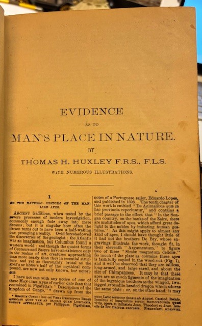 The “Evidence as to Man’s Place in Nature” book was originally published in 1863, four years after Darwin’s book came out. Huxley was made famous by comparing various primates with humans, and studying fossils for signs of evolution. It is interesting to read the book, especially in the old two column print on a page style.