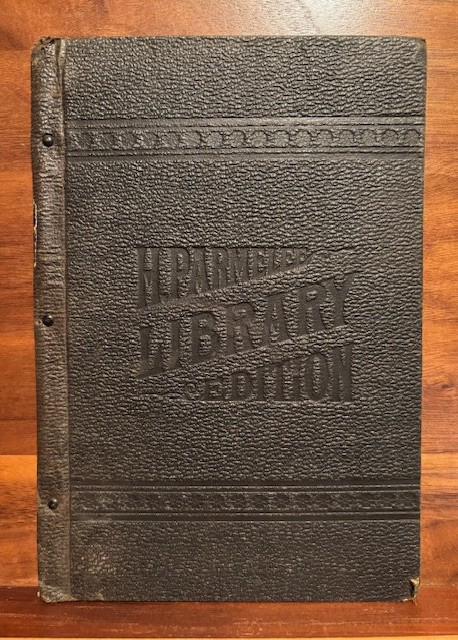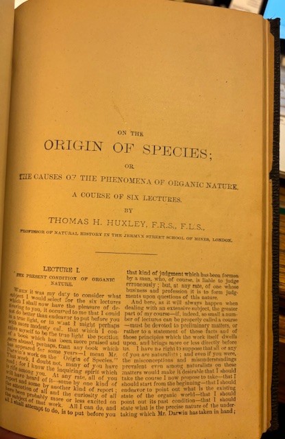 I have the pamphlet “Evidence as to Man’s Place in Nature” published by Humboldt Library of Science, perhaps 1882 or 1883. This work was number four in the series. It was then rebound in hardback by the H. Parmelee Library Company (more on that later) with another pamphlet “On the Origin of Species: a Course of Six Lectures” also by Thomas H. Huxley. This was number sixteen in the series of pamphlets, advertised as ‘a critical examination of Mr. Darwins great work.’