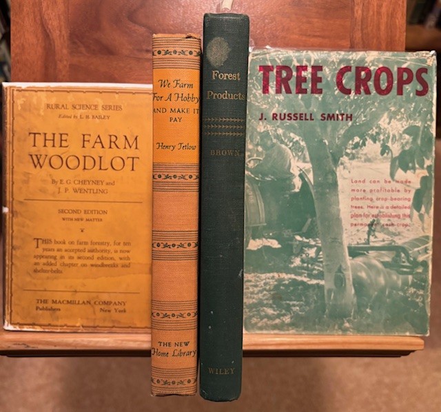 My other two books showing are “Forest Products” subtitle “The Harvesting, Processing, and Marketing of Materials other than Lumber, including the Principle Derivatives, Extractives, and Incidental Products in the United States and Canada.” by Nelson Courtlandt Brown, 1950. The other is “Tree Crops” by J. Russell Smith, 1929.