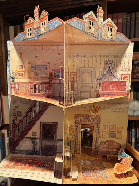 A little over twenty years later, King Edward VII (1901) became King of England. I have the book “A Three-Dimensional Edwardian Doll House” by Brian and Lizzie Sanders, 1995. This pop-up book spins open and ties in the back. It actually becomes a two-story, eight room doll house.