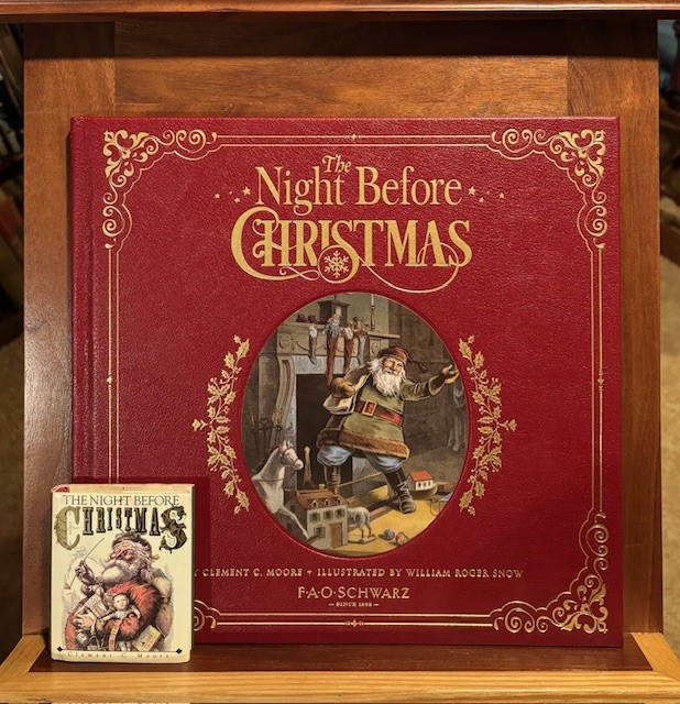 First, I have a large and small copy of Clement C. Moore’s “The Night Before Christmas”. F.A.O. Schwarz printed the large book of Moore’s poem, with the original illustrations by William Rodger Snow. This is a great book to hold when reading to the family.