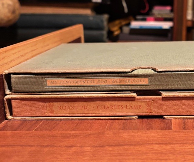 The second book is “Roast Pig, and other Essays” by Charles Lamb, published by the Peter Pauper Press in 1934. Not only is it a Peter Pauper Press book, today on December 27th, 1834, Charles Lamb died. This is an interesting story about Bo-Bo, a swine-herd’s son who burned down his father’s house and barn by accident, many centuries ago in China. While his father was upset, Bo-Bo discovered (and then taught the world about), the great taste of Roast Pig, as nine small pigs were burned in the fire. They were delicious.