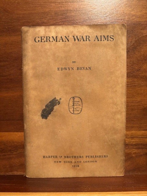 I have a couple of booklets that were published during Wilson’s Presidency. The first is “German War Aims” by Edwyn Bevan, published in 1918. This was during the time of vocal sentiment of what should happen to Germany after the war. It coincided with Wilson’s ideas, as it was printed by same publisher, and promoted with his book.