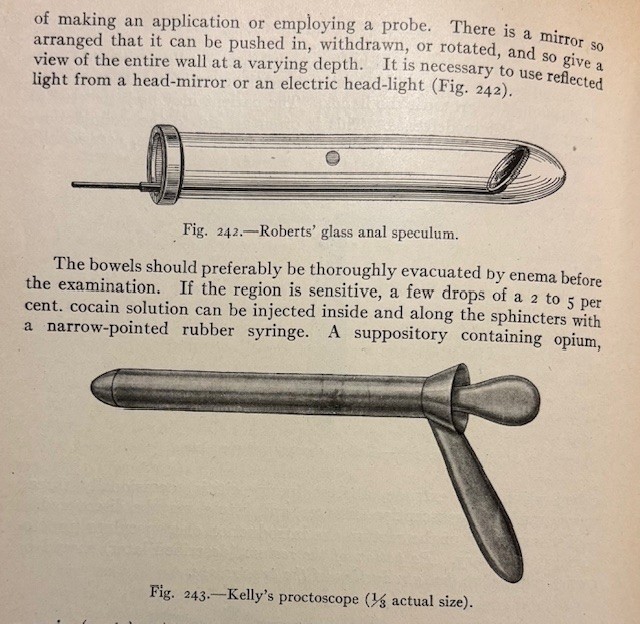 In discussing the ass (or anus), a doctor could use several tools for inspecting the ass: the speculum, the proctoscope, and the proctosigmoidscope. (The colonoscopy program with much longer “tubes” and cameras is a pretty recent program.) I have shown some illustrations. You can note in the comments that “if the region is sensitive, a few drops of cocain (sic) solution can be injected inside and along the sphincters.”