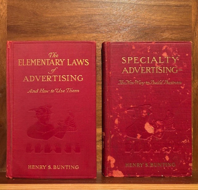 Advertising, is the art of convincing someone to buy a product, or to change their point of view. I learned much about that in college. In my library, I have some wonderful collectable books on Advertising. Let me promote several. First is “The Elementary Laws of Advertising, and How to Use Them” by Henry S. Bunting, 1913. It is signed by the author. The second book, also by Henry S. Bunting is “Specialty Advertising, The New Way to Build Business”. This was a third edition, published in 1925.