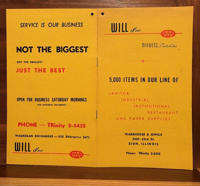 I have taken a picture of the back and front cover of a pamphlet that broke down all the different supplies Will Inc sold. They mainly worked throughout Lake County, Illinois, along with southern Kenosha County, in Wisconsin. Will Inc continued to sell all types of brooms and brushes.