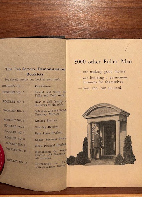 To the book “The Fuller Service Demonstration” by The Fuller Brush Company, published 1924. This is a training book for Fuller Brush Door-to-Door Salesmen.