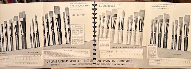 You may think I have a book on Bob Ross, that painter. I do not. But I found the book “Brushes for Art and Industry” by M. Grumbacher, Inc, published 1947.