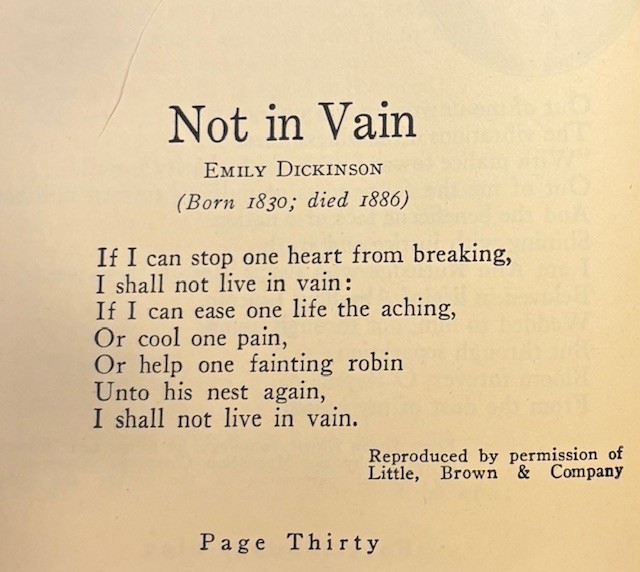 I also enjoyed this small poem in “101 Famous Poems”, “Not in Vain” by Emily Dickinson.