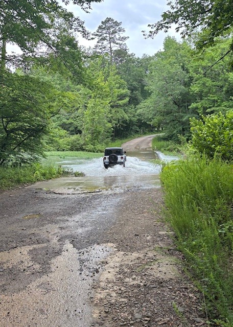 Other falls had to be driven to by Jeep. We broke in our friend’s new Jeep. We did turn around from this flooded river (called Big Piney Creek).