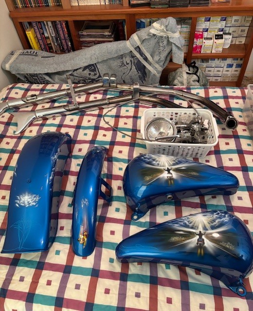 and tail pipes, along with freshly painted tins sitting on a bed. Behind the bed is the already wrapped, also freshly painted frame. All these pieces are calling for me to put back together.